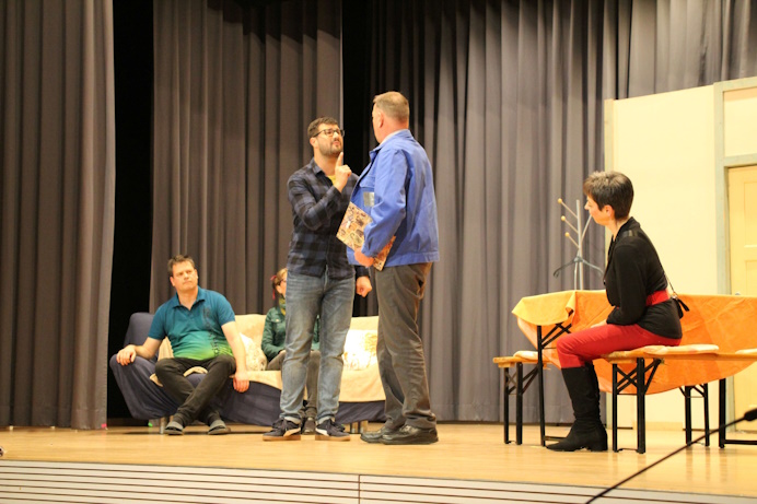 Das Stück lebt von einem großen Wirrwarr auf der Bühne, ein ständiges Kommen und Gehen, das unter der Regie von Patricia Baum und mit einem neuen, modernen Bühnenbild zu einem kurzweiligen Vergnügen wird. Sybille Scalisi als Souffleurin und Luise Berger, die für die Maske zuständig war, haben zum Erfolg beigetragen. Das Publikum dankt es den Darstellern mit viel Gelächter bei den einzelnen Szenen und am Schluss mit einem herzlichen Applaus für die Darsteller.
