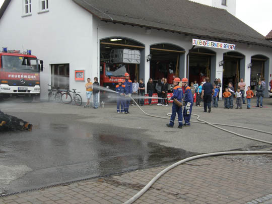 | Mit einem Schnupperabend präsentierte sich die Jugendfeuerwehr Renchen. 16 Jugendliche fanden sich am Renchener Gerätehaus zu dieser Veranstaltung ein. Nach der Begrüßung zeigte eine Gruppe die Vorgehensweise bei einem Brandeinsatz. Hierzu wurde ein kleines Feuer entfacht. Nach dem Aufbau der Wasserversorgung aus einem Überflurhydrant konnte an drei Strahlrohren "Wasser marsch" gegeben werden. Vorbildlich auch die weiteren Tätigkeiten wie die Verkehrsabsicherung mit Verkehrsleitkegeln und Warndreiecken. Infotafeln informierten mit Bildern über die weiteren Aktivitäten wie Zeltlager und Ausflüge in der Jugendorganisation. Auch Jugendliche ab einem Alter von zehn Jahren, die an dieser Infoveranstaltung nicht teilnehmen konnten, sind weiterhin zum Mitmachen willkommen. Die Treffen finden Donnerstags ab 18.30 Uhr am Gerätehaus Renchen statt. Weitere Informationen und Kontakte finden Sie hier. | ||