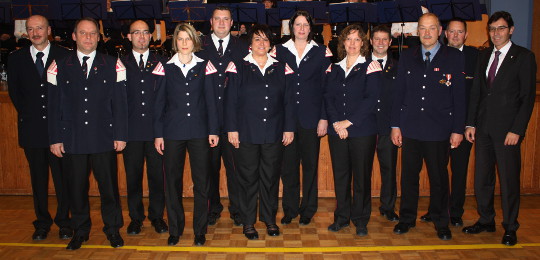 Brandstetter und Sybille Scalisi im Spielmannszug. Alle drei geehrten